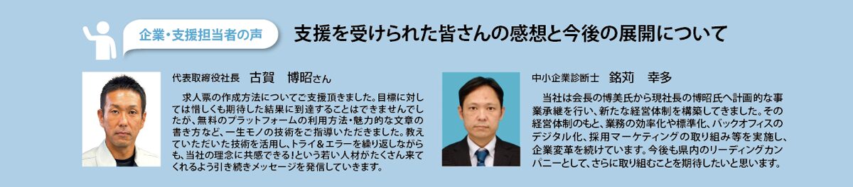 採用は求人票を出したら終わりではなく、出した後も反応を見ながら改善していくPDCA活動が不可欠です。今回の支援では継続的な採用活動ができるように、採用担当者と一緒になって求人票を作成、公開し、技術移転を行いました。