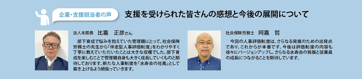 今回の人事評価制度の導入に際しては、リーダーの皆様に企業理念を浸透させながら人材の育成を達成させるために、水寿会として必要な人材像や、チームのメンバーにどのように成長してもらいたいかについてご意見を伺いました。これらの意見をもとに、目指すべき人材像を明確にし、それに基づいた評価シートを作成いたしました。また、評価を行うリーダーの皆様には、パーソナルトレーナーのように従業員を応援する立場で支援し、メンバーへのアドバイスを行いながら評価を行うことを心掛けていただきました。