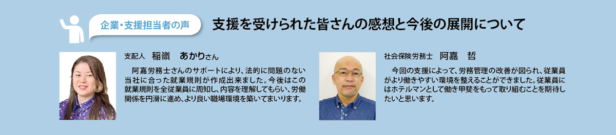 今回の支援によって、当法人の実態にあった就業規則の運用が可能となり、従業員も規定に沿った働き方ができるようになりました。また、これまで懸案であった不安が解消され従業員が一丸となって業務に取り組む姿勢が強まりました。