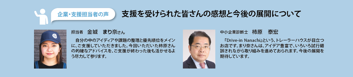 今後の事業について、いろいろなプランをお持ちであり、今回の支援を受けて、そのプランを着実に実現していくための、ひとつのステップになったものと思います。今後の事業実施においては、ぜひ今回の検討内容を踏まえ取り組んで頂きたいです。