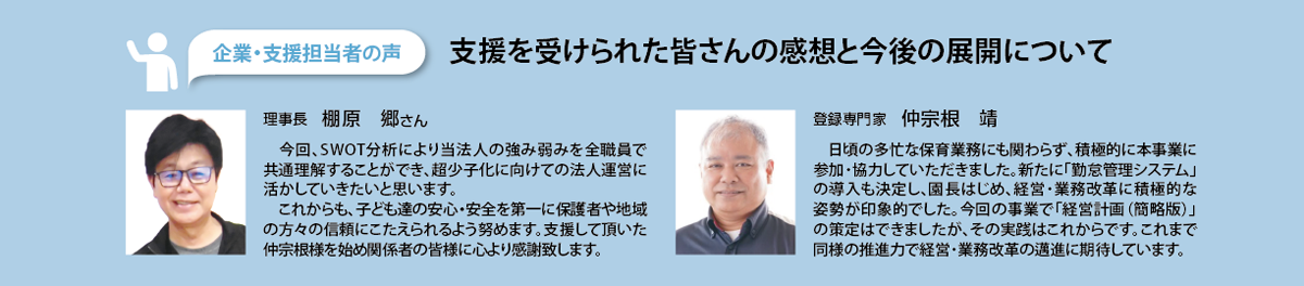 これらを含めた「戦略マップ(BSC)」「経営計画書(簡略版)」を整備することができ、その過程で幹部候補生の育成も実施することができました。最後に予定した事業目標設定も「子ども達の安心・安全を第一に保護者・地域からの信頼獲得!」となりました。