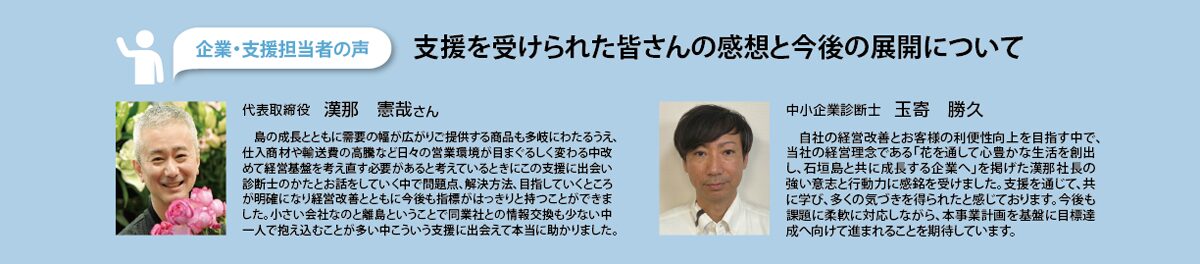 本事業においては、漢那代表からの依頼を受け、経営ビジョン、中長期経営戦略、及び事業計画の策定支援を実施しました。