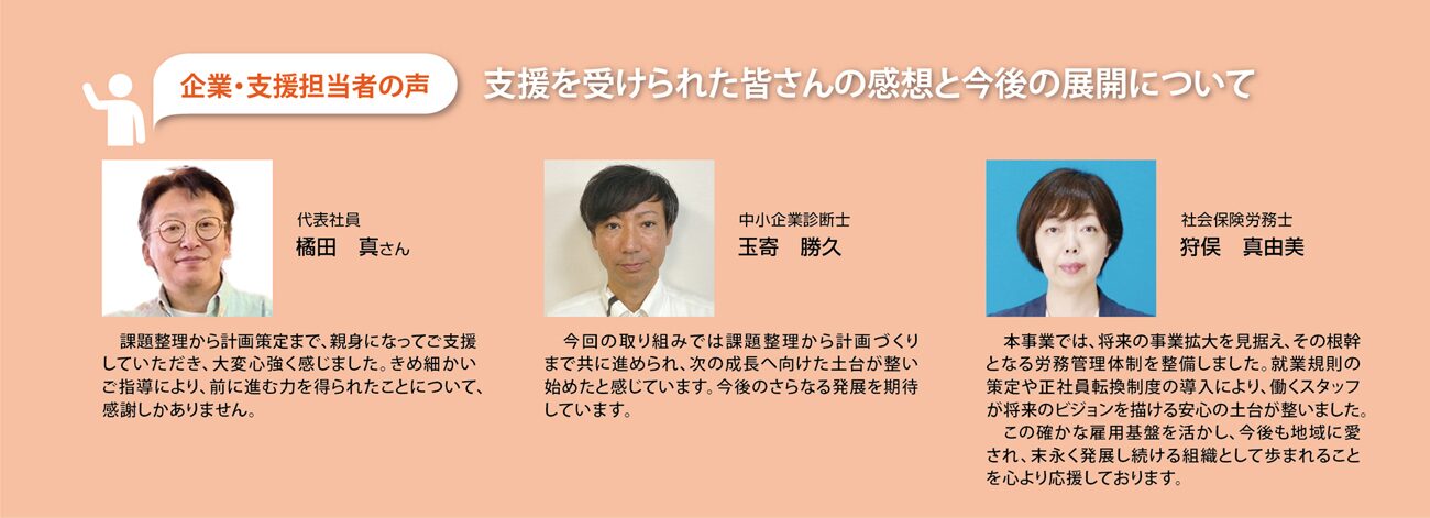 次に就業規則等の作成において、月給制の導入や職務・住宅手当等の規定を盛り込むことで、正社員として働くメリットとモチベーションを維持できる仕組みを整えました。同時に、多様な人材確保と定着を見据えた両立支援の一環として、育児介護休業規程も新たに作成しました。