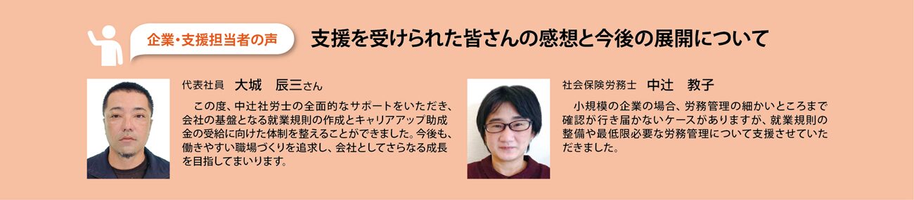 そこで、キャリアアップ制度の導入に加え、育児・介護休業規程の整備も同時に進め、安心して働き続けられる職場環境を整えることが重要な課題となりました。