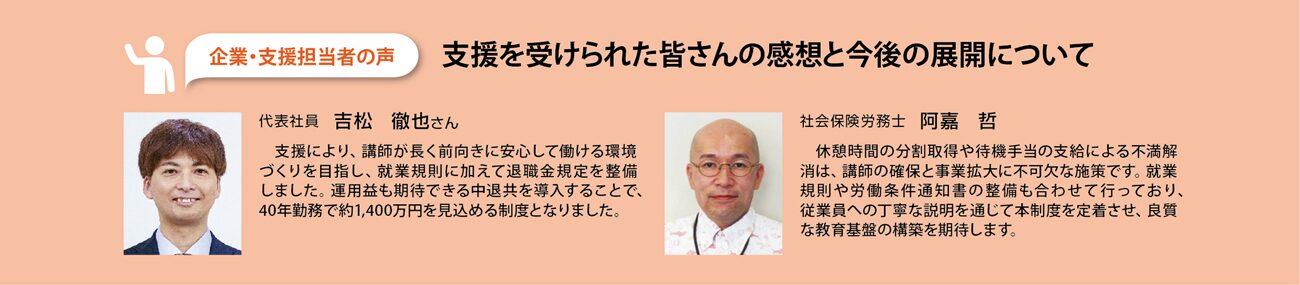 講義間の空き時間を業務と休息に分けた新制度を導入したことで、受講生への質問対応に対して適正な手当が支払われるようになり、講師の仕事への納得感と意欲が大幅に向上しました。外出許可によって長時間の拘束に伴う心身の疲れが劇的に軽減された結果、教育の質が安定したのみならず、講師の離職リスクが解消されてベテランから若手までが安心して教壇に立てる環境が整ったことで、受講生にとっても「いつでも質の高い講義と丁寧なサポートが受けられる」という目に見える安心感に繋がり、講師の労働環境の適正化がスクール全体のブランド力と信頼性を底上げするという、経営・講師・受講生それぞれにとって価値のある持続可能な教育モデルを確立することができました。