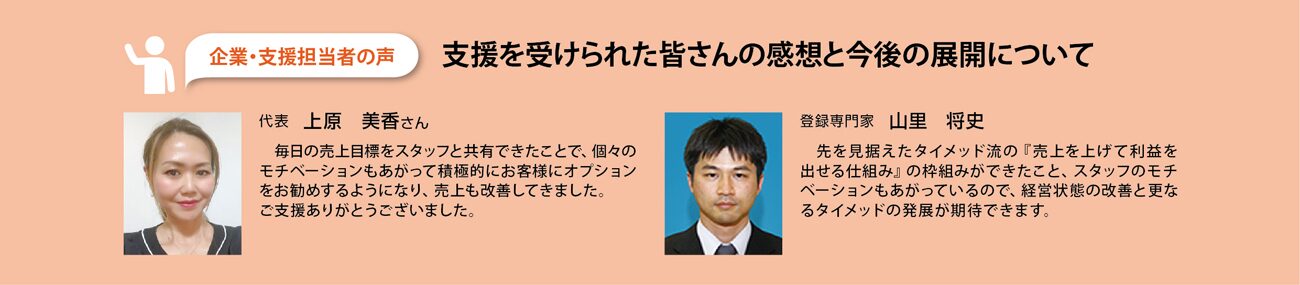 これまでは、どれだけ売上があれば利益が残るのかが分からない状態で経営をしていましたが、今回の支援により目安となる1日、1週間、1ヶ月間ごとの売上額・顧客数などが把握できたことで、スタッフにも毎日の目標ができモチベーションアップにもつながりました。また欲しい利益を出すために必要な売上額が分かったことで、それを達成するために改善すべき事、取り組むべき事が明確になり、タイメッド流の『売上を上げて利益を出せる仕組み』の型を作りあげることができました。