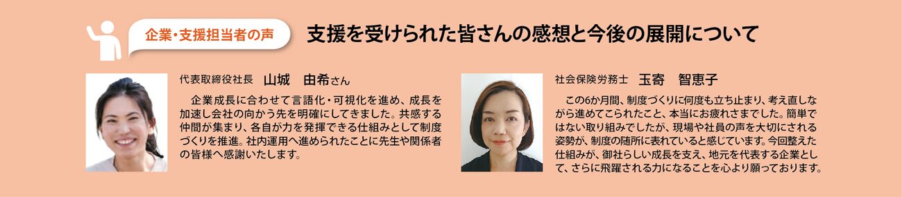 評価制度を現場実態に合わせて再構築したことで、制度が「形だけの仕組み」から「実際に使える制度」へと転換しました。等級ごとの役割や期待行動が明確になり、社員自身が成長の方向性を理解しやすくなったほか、評価者側も判断基準を共有できるようになりました。社員説明会では、社長からの会社目標の提示、各部署のリーダーによる目標を宣言したことで、一体感を感じることができました。賃金制度、評価制度、就業規則を連動させたことで、処遇決定の根拠が明確化されたため、今後の社内の納得感向上につながることを期待します。また、制度運用に対する不安や誤解が解消されるように、定期的な面談を通じたコミュニケーションの土台を整えました。これにより、社員のベクトルを会社目標に合わせること、早めの承認による人材育成に繋げることができる仕組みになりました。今後は、社内の運用メンバーでさらにブラッシュアップしてほしいです。