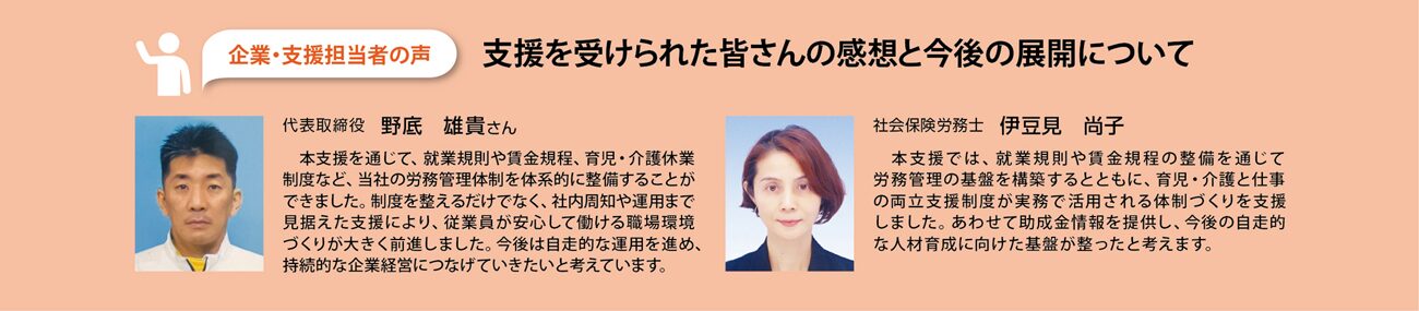 また、育児・介護と仕事の両立支援については、規程整備に加え、管理者への理解促進および社内周知を行ったことで、制度が実際に活用されやすい環境づくりが進みました。
